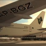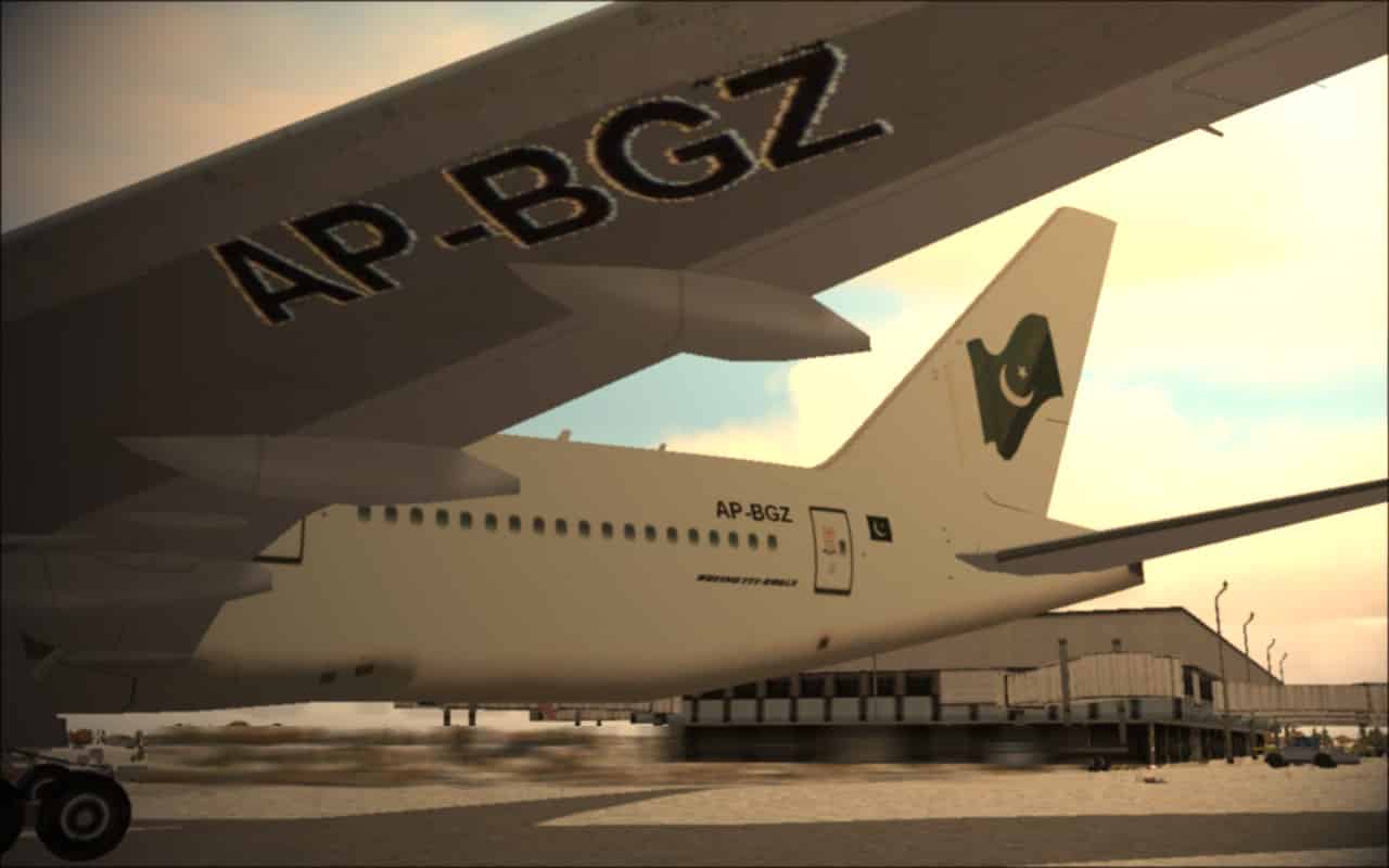 FSX PIA Boeing 777-240LR. Pakistan International Airlines B777-240LR, registration AP-BGZ, “World Distance Record Holder”, utilizing Project Open Sky 777-200LR VC v2 model. This aircraft, whilst wearing Boeing’s livery, as N6066Z, flew the world’s longest distance flight from Hong Kong to London, the long way. It covered 11664 nm in 22 hours 43 minutes, to gain the “World Distance Record Holder” title. It was delivered to PIA as AP-BGZ, and along with the wavy flag tail livery, it also features a small sticker next to door L1, celebrating its title and record. That sticker is depicted on this repaint, after being extracted from a real world photo, and if you zoom in you can see it. Features full virtual cockpit. Contains ground service vehicles, tow truck, catering trucks, stairs, luggage loaders and containers painted in standard PIA colors. Contains all updates until 2009 including virtual cockpit and tow truck. Updated .mdl and FDE. Complete pack, requires no external downloads. Textures in DXT3 format to avoid blurring. Base texture by Jonathon Sze, repaint by Ahmed Ahsen, from Virtual PIA. currently in the old PIA livery.
