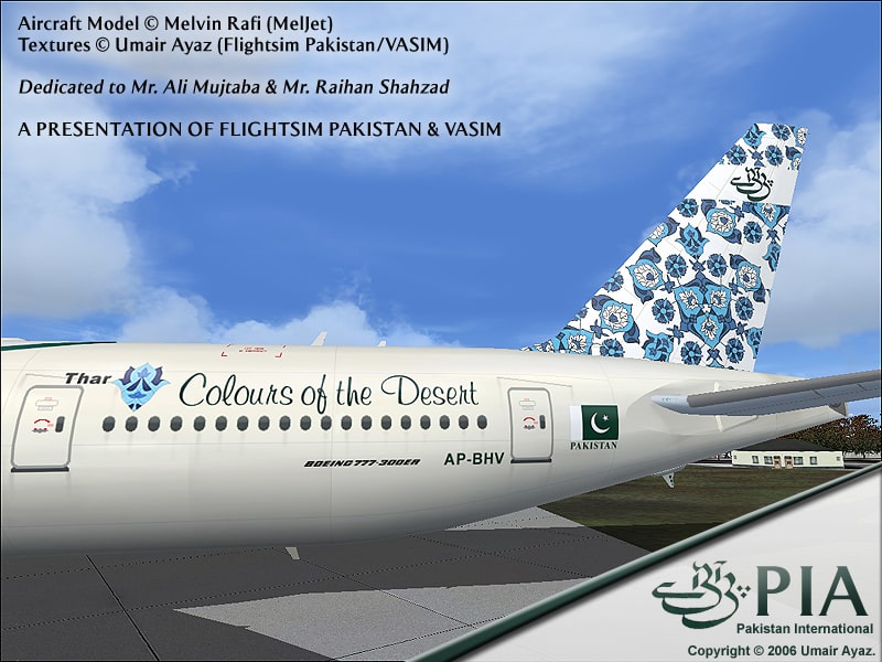 PIA Boeing 777-300ER, registration AP-BHV, in the current cultural promo livery of Pakistan Int’l and christened “Thar – Colours of the Desert”. Texture features include completely photorealistic hand painted textures; alpha channel and tail extures have been extracted out of a real life photograph. Model by Project Opensky.