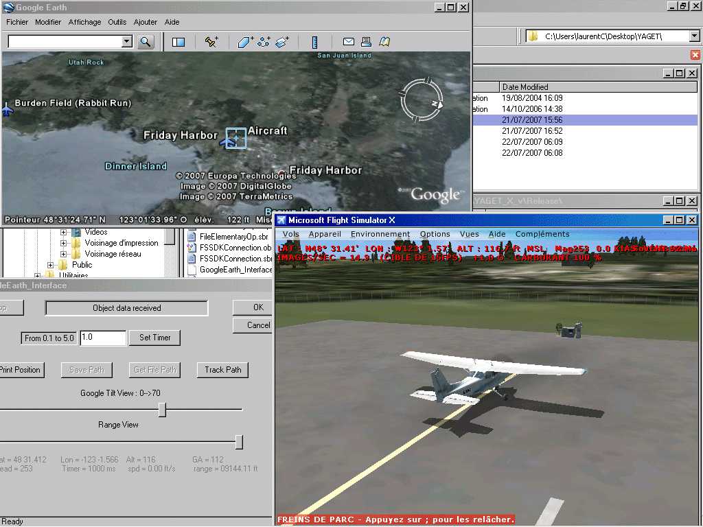 FSX Yet Another Google Earth Tool.(v0.94). YAGET FSX (yet another goggle earth tool) V 0.94 Version updated for adjustments with Google Earth release from May 24th 2007 and above (had to add a view “range” slider). This little program for FSX allows to save two types of files : a single position file and a complete path file for Google Earth program (Each leg of the path is ~1NM long). It also allows to create a direct link between a Google Earth window and an instance of FSX and to follow your position on the Google view (track mode). By C Laurent. 1.1MB