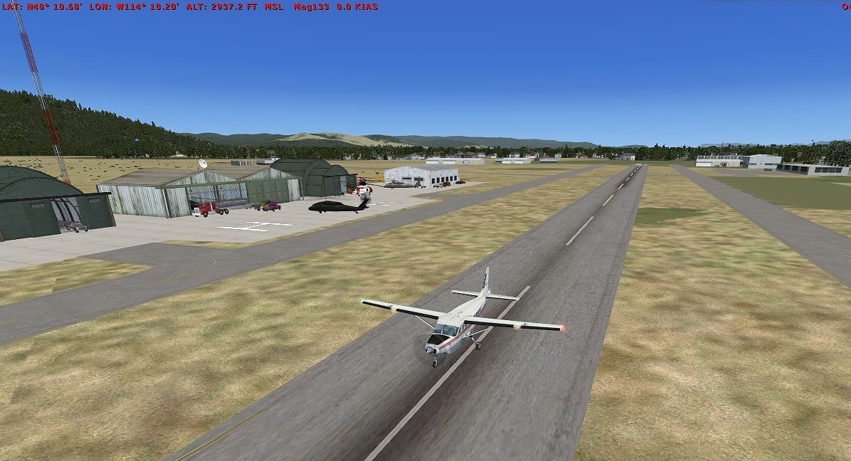 FSX Kalispell City Airport (S27) additions, Montana (MT). Includes two military style hangars, one new style hangar and a warehouse along with upgrades to the default airport adding taxiways and parking areas, many vehicles (ground vehicles and aircraft) and two start / landable helipads.