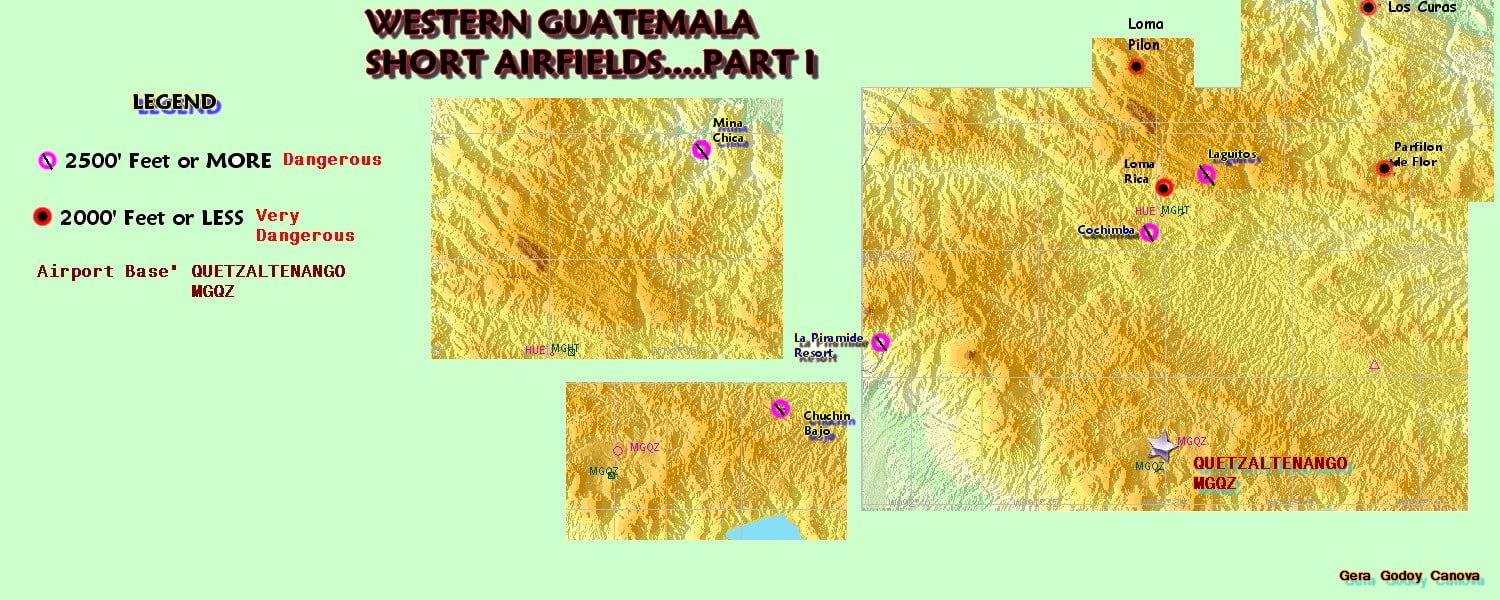 Guatemala in very mountainous, some call it the “Switzerland of Central America”. Full of Volcanoes and mountains cover the whole country, the Western Part particularly so. I have “made up” some pretty hairy “airfields” where you can just go and risk your “Cyber neck”—- Since Bush Pilots do their own navigation most of the time and fly in some rugged areas I decided NOT to make a MISSION for FSX, but rather leave the flying to each pilot. maybe you can have a Risky Weekend flying the dangerous skies of Guatemala!!!!!!!! You will find some fields “going uphill!!!” and others on ” top of a leaning hill”……sweet hu?????…you should clean and shine that Super Cub, Porter, Auster, or similar or if you really want to have sweaty palms and a running stomach…try the Cessna 182 or 206!!!!! If you really want to hear the “razzle dazzle” of your knee bones as you push pedals try some of these fields at Dusk!!!! and if you want that sweet little piece of loving girl you got as co-pilot to shout her beautiful chest out and cause a sonic boom as you land try getting to some of these field at Night!!!!…Yup!!! some are lighted!! or something like that (??)….. Don’t gas up the machine to the top…fly light!!!!